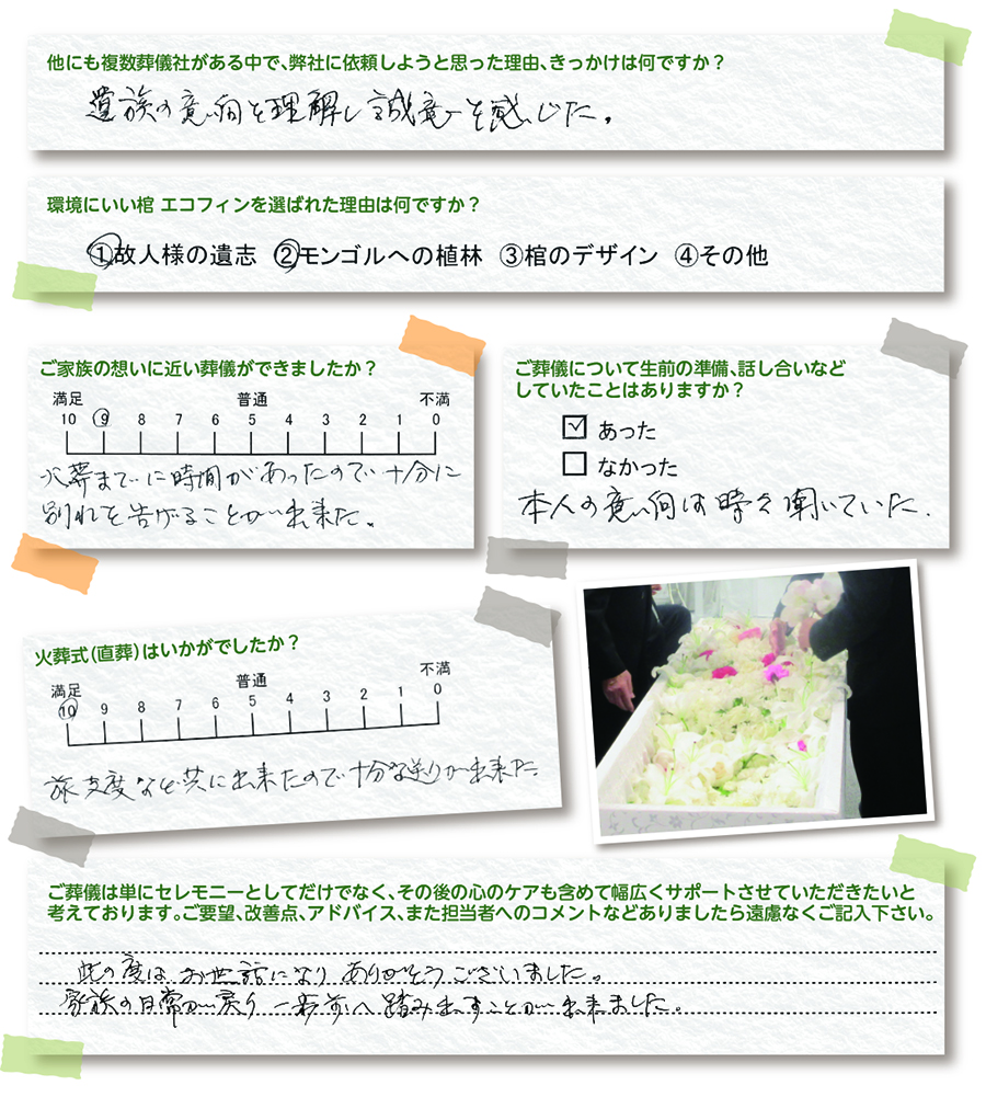 故人様、ご遺族様の意向により、火葬式でのお別れとなりました。ご火葬日までお時間があったので、ご家族様だけではなく、ペットのワンちゃんも一緒にご面会していただくことができました。長年、地元で食堂を経営されていた故人様は、柔道をされていて、お孫さん達3人も柔道の道に進まれました。一番上のお孫さんは、雲の上のおじい様に高校合格の報告をされました。