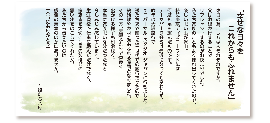 家族を大切にされていたお父様。休日はよくご家族で出かけられ、東京ディズニーランドや三世代での大阪旅行など、思い出もたくさん。ご夫婦で寄り添いながら過ごされた日々にも、深い絆が感じられました。葬儀では「本当にありがとう」との感謝の言葉とともに、ご家族の温かな想いに包まれたお別れとなりました。