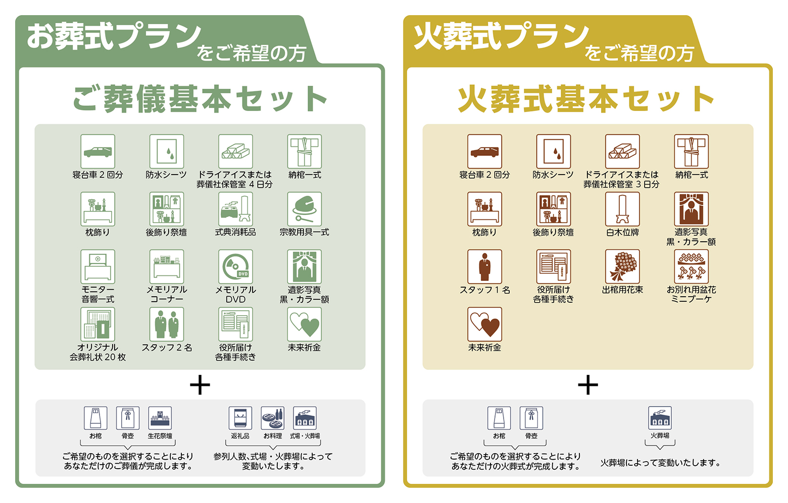 【ご葬儀基本セット】【火葬式基本セット】のいずれかをお選びいただきます。